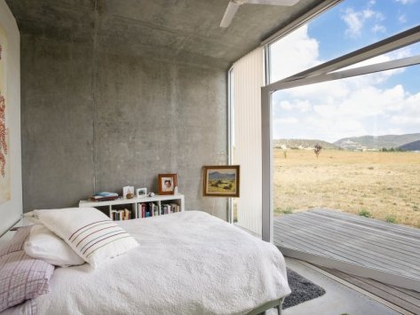 Built with concrete for long-lasting durability, the house is designed to take full advantage of passive solar energy. Fibre cement shade awnings, large curtains, and a future green wall on the exterior facade will all help to conserve energy. The house is also run from a 3.5kW stand alone solar system, eliminating the need for toasters and hair dryers. Additionally, a dam provides water to the newly planted orchard and gardens, and little waste was generated in the construction due to its prefabricated nature. Finally, the house is heated by hydronic underfloor heating and two slow combustion heaters.